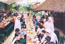 Đúng là sau lễ thì cũng vẫn cứ phải có lạc, nhưng hôm nay, ở đây không có súp măng cua, không có bát bửu, không có bánh hỏi thịt quay, không có những tiếng dzô dzô dị hợm của bia bọt, không có những tiếng đập bao khăn mặt lốp bốp như pháo, không có những lời chúc tụng sáo rỗng đến tội nghiệp ! Chỉ là cơm canh xào nấu đời thường, y như ở nhà, chỉ khác là đông quá, vui quá đi thôi. Văn nghệ dã chiến thì hấp dẫn vô cùng, khiến chẳng ai còn mải nói chuyện riêng ồn ào, quên cả lia đũa để trố mắt dỏng tay nghe các em Mái Ấm Huynh Đệ Như Nghĩa của các dì Phan Sinh hát. Chú “Dakêu” Y Beo người Bahnar đeo kính đen biểu diễn nổ máy xe lam bằng miệng, nghe thầy Phong, cô Hải cùng đệ tử Thiên Ân giới thiệu: “Ở Mái Ấm của chúng tôi, niềm vui nhân gấp đôi”, nghe Gia Đình Halleluia làm cử điệu hát vang: “Ta chỉ có một Chúa trên Trời là Cha, ta chỉ có một Đức Kitô là Thầy, còn chúng ta là anh em !”